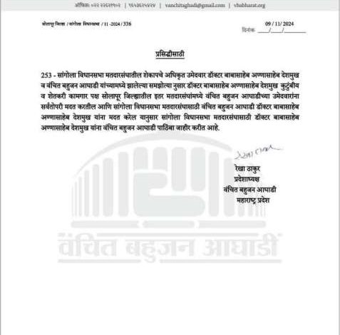 253 – सांगोला विधानसभा मतदारसंघातील शेकापचे अधिकृत उमेदवार डॉक्टर बाबासाहेब अण्णासाहेब देशमुख व वंचित बहुजन आघाडी यांच्यामध्ये झालेल्या समझोत्या नुसार डॉ.बाबासाहेब अण्णासाहेब देशमुख कुटुंबीया व शेतकरी कामगार पक्ष सोलापूर जिल्ह्यातील इतर मतदारसंघांमध्ये वंचित बहुजन आघाडीच्या उमेदवारांना सर्वतोपरी मदत करतील आणि सांगोला विधानसभा मतदारसंघासाठी वंचित बहुजन आघाडी डॉ.बाबासाहेब अण्णासाहेब देशमुख यांना मदत करेल यानुसार सांगोला विधानसभा मतदारसंघासाठी डॉक्टर बाबासाहेब अण्णासाहेब देशमुख यांना वंचित बहुजन आघाडी पाठिंबा जाहीर करीत असल्याचे पाठिंबा पत्रात नमुद करण्यात आले आहे.
