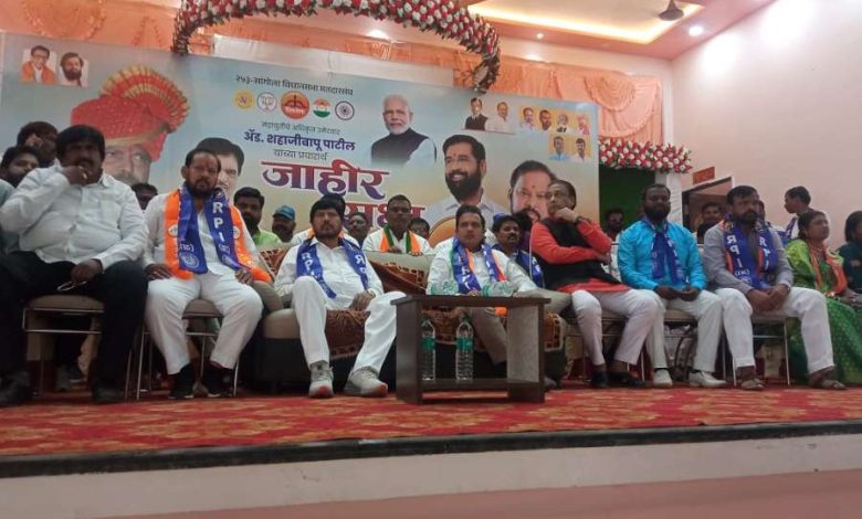 यावेळी महाराष्ट्र प्रदेशाध्यक्ष राजाभाऊ सरवदे ,शिवसेना नेते विजय शिंदे, आरपीआयचे तालुकाध्यक्ष खंडू सातपुते यांनी आपल्या मनोगत सांगितले की, शहाजीबापूंनी तालुक्यात मोठ्या प्रमाणात विकास साधला असून भारतरत्न डॉक्टर बाबासाहेब आंबेडकर यांच्या स्मारकासाठी 2 कोटी रुपये निधी खर्च केला . तालुक्यातील शेतीच्या पाण्याचा प्रश्न मार्गी लावला तसेच महायुती सरकारने दिलेल्या निधीतून कोट्यावधी रुपयाची कामे केली. नाम. रामदास आठवले यांच्या सांगोला येथील सदानंद मल्टीपर्पज हॉल मधील सभेसाठी मोठ्या प्रमाणात जनसमुदाय उपस्थित होता. यावेळी सर्वांनी आमदार शहाजीबापू पाटील यांना मोठ्या मताधिक्याने विजयी करण्यासाठी प्रयत्नशील राहु असे ठामपणे सांगितले.