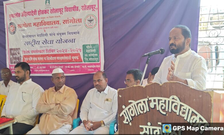 सांगोला / प्रतिनिधी : पुण्यश्लोक अहिल्यादेवी होळकर सोलापूर विद्यापीठ,सोलापूर, सांगोला महाविद्यालय सांगोला व ग्रामपंचायत मेडशिंगी यांच्या संयुक्त विद्यमाने राष्ट्रीय सेवा योजनेचे विशेष श्रम संस्कार शिबीर मौजे मेडशिंगी येथे दि.२५ जानेवारी ते ३१ जानेवारी २०२५ या कालावधीत संपन्न झाले. विद्यार्थ्यावर श्रम संस्कार व्हावेत त्यांच्यामध्ये सामजिक बांधिलकी ची भावना विकसित व्हावी या उद्देशाने हे शिबीर आयोजित केली जाते. या वर्षी ‘युथ फॉर माय भारत व डिजिटल साक्षरते साठी युवक’ ही थीम घेवून हे शिबीर आयोजित करण्यात आले. या सात दिवसीय निवासी शिबिरामध्ये विद्यार्थ्यांनी श्रमदाना बरोबर मेडशिंगी गावाचे ऐतिहासिक सर्वेक्षण, तसेच समाज प्रबोधनपर कार्यक्रमात सहभाग घेतला.