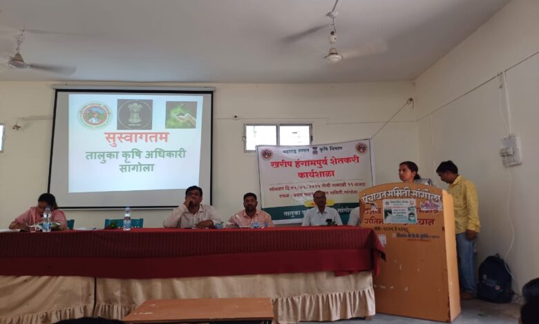 सांगोला तालुका कृषी कार्यालयाच्या वतीने अधिकारी ,कर्मचारी व शेतकऱ्यांसाठी खरीप हंगामपूर्व कार्यशाळा सोमवार दिनांक 5 मे रोजी सकाळी 11 ते 3 या वेळेत संपन्न झाली. या कार्यक्रमाचे अध्यक्षस्थान पंढरपूर उपविभागीय कृषीतंत्र अधिकारी पुनम चव्हाण यांनी भूषविले.