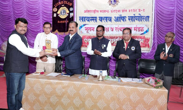सांगोला ( प्रतिनिधी ) आंतरराष्ट्रीय लायन्स संघटना प्रांत ३२३४ ड १ कॅबिनेट ऑफिसर ब्लड डोनेशन व सांगोला लायन्स क्लबचे माजी अध्यक्ष ला.प्रा.धनाजी चव्हाण यांचा बेस्ट कॅबिनेट ऑफिसर पुरस्काराने सांगोला येथे संपन्न झालेल्या पदग्रहण समारंभामध्ये माजी प्रांतपाल ला.सुनील सुतार यांचे हस्ते सन्मान झाला.यावेळी मार्गदर्शक प्रांतपाल माजी प्रांतपाल प्रा.प्रबुद्धचंद्र झपके, सांगोला लायन्स क्लबचे अध्यक्ष ला.प्रा.नवनाथ बंडगर,रिजन चेअरमन ला.श्रीनिवास कटकुर,झोन चेअरमन ला.सोमशेखर भोगडे उपस्थित होते.