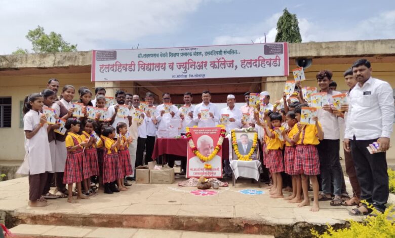 हलदहिवडी विद्यालय व ज्युनिअर कॉलेज हलदहिवडी ता.सांगोला येथे स्वर्गीय डॉक्टर आमदार गणपतराव देशमुख यांच्या जयंतीनिमित्त शालेय साहित्य वाटप