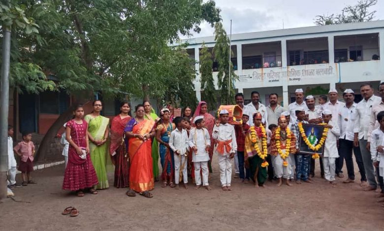 जिल्हा परिषद प्राथमिक शाळा बलवडी येथे इयत्ता पहिली ते चौथीच्या विद्यार्थ्यांचा दिंडी व रिंगण सोहळा पार पडला.यावेळी दिंडी सोहळ्यातील विठ्ठलाच्या प्रतिमेचे पूजन शाळा व्यवस्थापन समितीचे अध्यक्ष मा.श्री.संदिप खुळपे यांनी केले तर विठ्ठल रुक्मिणी बनलेल्या विद्यार्थ्यांचे पुजन शिवसेना युवा नेते श्री साहेबराव शिंदे व शाळा व्यवस्थापन समिती सदस्या सौ.संगिता ढोबळे मॅडम यांनी केले.शाळेच्या मैदानावर रिंगण सोहळा पार पडला